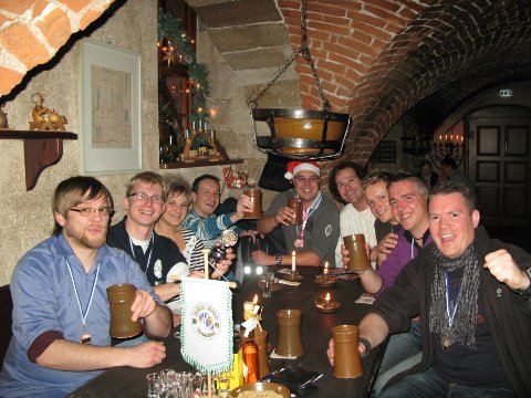 Pünktlich ging es vom Hauptbahnhof Dresden mit fast allen Mitgliedern in Richtung Weesenstein los, inklusive dicker Winterbekleidung. Die Wetterbedingungen fürs weihnachtliche Gefühl waren ideal, wenn da nicht die Bitterkälte gewesen wäre. Kleidungsbestnote erhielt mit voller Stimmzahl unser weißer Schneehase Susi…10+. Nach dem Tarifdschungel am Automaten ging es stimmungsvoll in unsere S-Bahn hinein. Mit attraktiven Stehplätzen zwischen den tschechischen Heimreisenden war ein leichter Smalltalk die Folge. Diese wurde leider durch die knackig und gut gebaute Schaffnerin unterbrochen. Diese hatte ein Auge auf unseren ruhigen Thomas geworfen. Unter dem Vorwand des Falschfahrens war eine knisternde Stimmung auszumachen. Ein bisschen später war der Bahnhof Weesenstein erreicht und ein leichter Fußmarsch bei gefühlten -20 Grad Celsius in Richtung Burg die Folge. Um die Wartezeit bis zum reservierten Brautisch zu überbrücken haben alle Mitglieder einstimmig eine Einkehr im benachbarten Burgweihnachtsmarkt zugestimmt. Warum diese sofort am Glühweinstand endete, ist uns unerklärlich. Mit leckerem Heißgetränk wurden tiefgefrorene Partien aufgetaut und eine perfekte alkoholisierte Vorfreude erreicht. Mit dieser Vorfreude ging es pünktlich zur Einkehr ins Braustübl und unserem urigem Tisch. Die Weihnachtsfeier des Unoclubs war ab jetzt hiermit eröffnet und im vollem Gange. Die erste Amtshandlung unseres Präsidenten waren die dezente Platzierung unseres Vereinswimpels, für jeden Gast gut sichtbar, und eine gefühlvolle Antrittsrede wo alle Mitglieder begrüßt wurden. Ebenfalls wurden zwei neue Vereinsstellen bekannt gegeben und bestätigt. Unser einziges weibliches Mitglied Susi ist als Schatzmeister der Meisterschaftskasse ins neue Jahr gestartet und Asylbayer Tobias als neuer Pressesprecher. Alle beide versprachen intensiven Tatendrang. Darauf erfolgte die mit Spannung erwartete Wichtelbescherung, wobei diese mit Drang aller Mitglieder nach dem einzigem „Westpaket“ geprägt war. Alle Mitglieder waren nach dem „Auspackahaeffekt“ erfreut über ihre Geschenke. Auszugsweise ist zum Beispiel Micha seinem Telekomservice wieder einen Schritt weitergekommen, bei Familie Kriebitzsch wurde ihre Vorliebe nach Wein und Bier befriedigt und unser Präsident mit Hanna Montana wunschlos glücklich gemacht. Unsere Weihnachtsfeier wurde ständig mit leckerem selbstgebrauten Bier begleitet, wo leider unsere Susi mit ihrem Wunsch nach Wein ein bisschen zu kurz gekommen ist. Nach dem Durst kam der Hunger und unsere Vorfreude war heftig. Im Ganzen war das Pfundsfleisch etwas wenig, aber lecker. Zu unserer Rettung hat Robert „The Flirter“ der Bedienung einen Batzen Fleisch herausgezwinkert. Mit nun doch vollem Bauch war eine Verdauerrunde vorprogrammiert. Nach Speis und Trank und einer Antrittsrede unseres Pressesprechers Tobias hatten die Unoclubmitglieder einstimmig Lust ihren Erfolg des Jahres 2010 einzustreichen. Dies war von unserem „Präsidente“ perfekt vorbereitet. Jedes Mitglied erhielt seine erarbeitete Ehrenmedaille als Belohnung für harte Unoabende. Beginn war beim Außenmitglied Tobias der Exilbayer mit seinen 0 Punkten, über Familie Kriebitzsch die knapp nebeneinander ihre Punkte teilten, dann Marco der leider nicht bei uns weilte. Robert und Hübi bekamen ebenfalls mit einer festen Umarmung ihre verdiente Medaille. Und dann kam unser Präsident….ja unser Präsident der Herzen. Dem Pokal wieder abtrünnig und mit vielen Punkten entfernt, aber doch unser Spieler des Herzens 2010. Wir hoffen, dass Thomas L. irgendwann seinem Polkalträumen ganz nah sein wird. Die Rangliste an der Spitze war knapp und mit unserem Spitzenduo Stefan auf Platz 2 und dem Unoclubkönig 2010 Micha besetzt. Der unangefochtenen Nummer 1 wurde der Pokal von unserem Präsidenten feierlich übergeben, wo auch andere Gäste beim Applaus langsam neugierig wurden.
